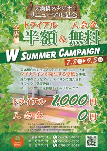 天満橋店のリニューアルを記念致しまして、全店で“トライアル半額” & “入会金無料” のWサマーキャンペーンを実施致します。